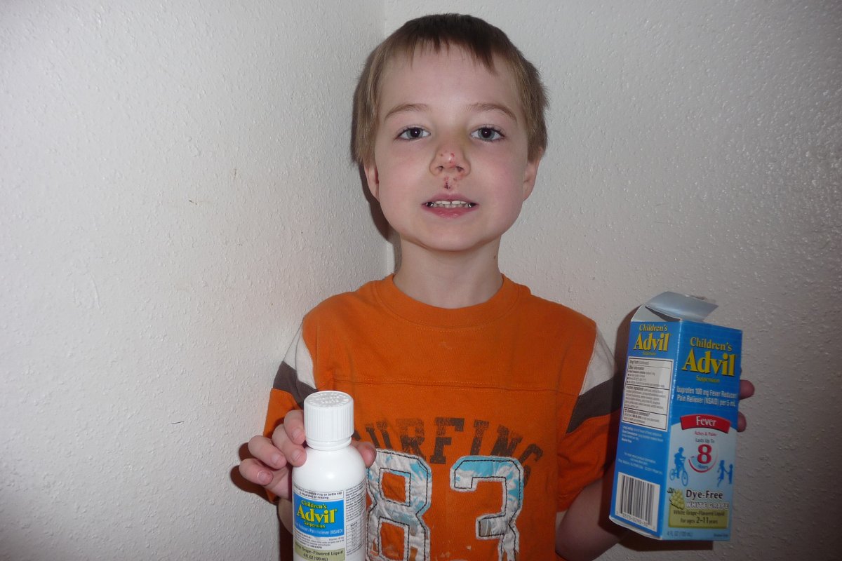 C face-planted earlier this week and it was pretty bad.  To make a long story short, he was running off the deck and the older girls were kicking a ball.  Somehow the ball hit him, his feet slipped from under him and he launched face first into the beam of our rock pit - um, ouch!  He was a bit of a mess.  Well, he got a dose of Advil - this time Children's Advil.  I really like that it is long lasting (up to 8 hours) and I could dose him without worrying too much (I am still his mother :)) during the night.